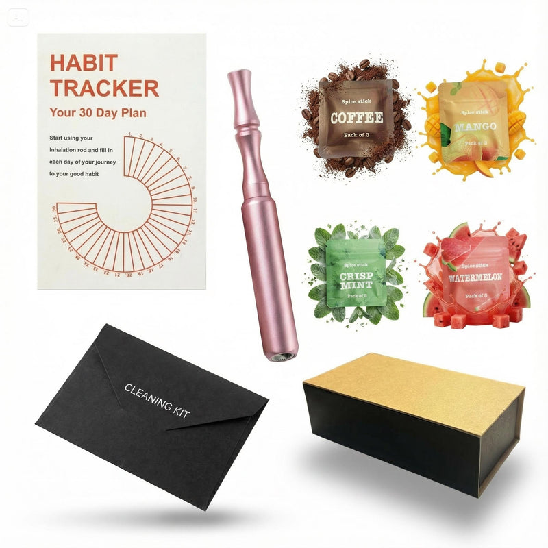 Each Breezi kit includes one premium stainless steel device in your chosen color, four flavour air pods, a carrying case, a user guide, a cleaning tool, and a habit tracker.